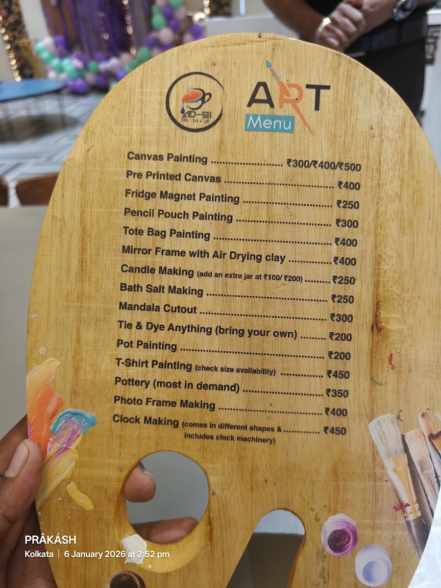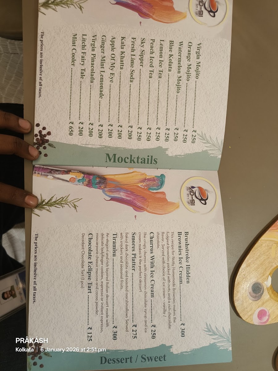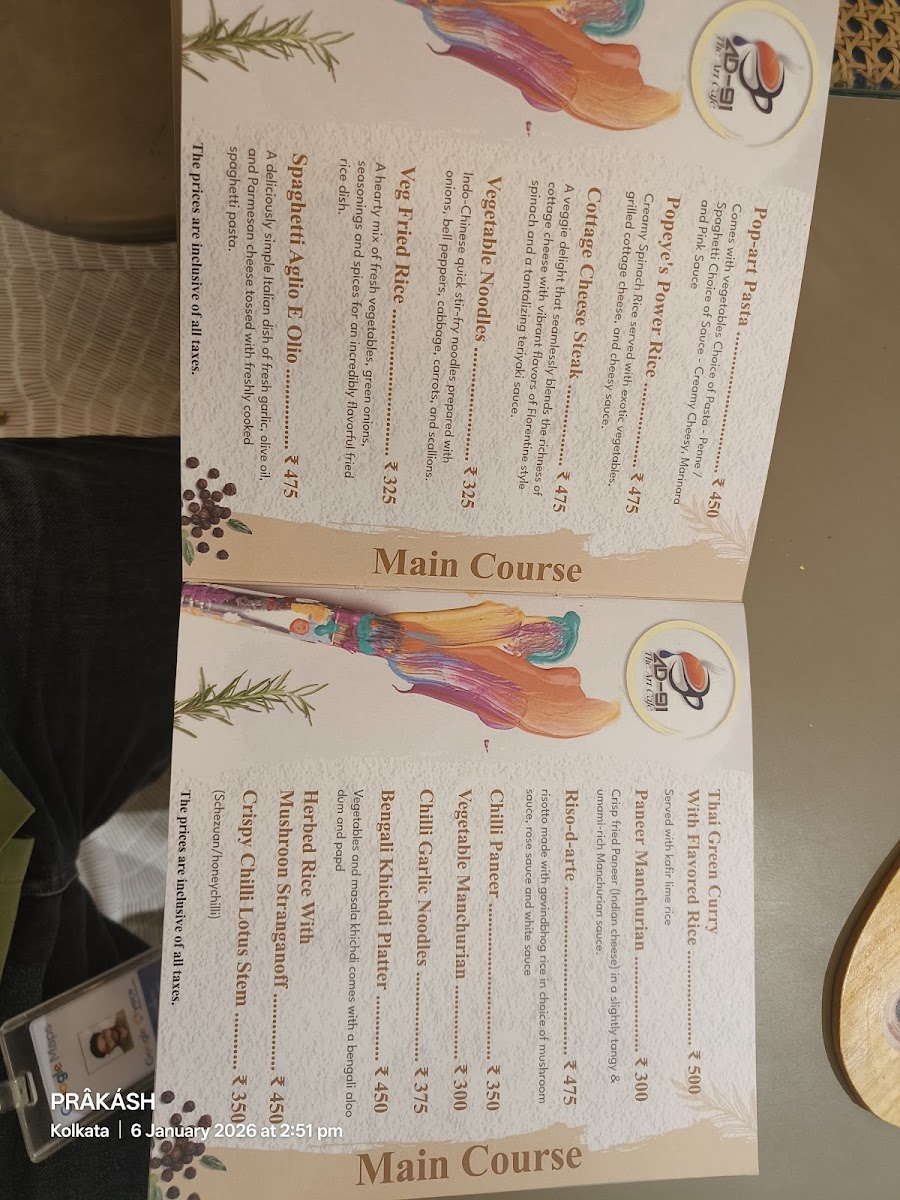 The menu structure is designed to complement the creative and relaxed setting, making it suitable for coffee breaks, casual meetups, and light meals throughout the day. Food items typically include vegetarian dishes with simple preparations, and drinks are offered to accompany the art activities or social gatherings.