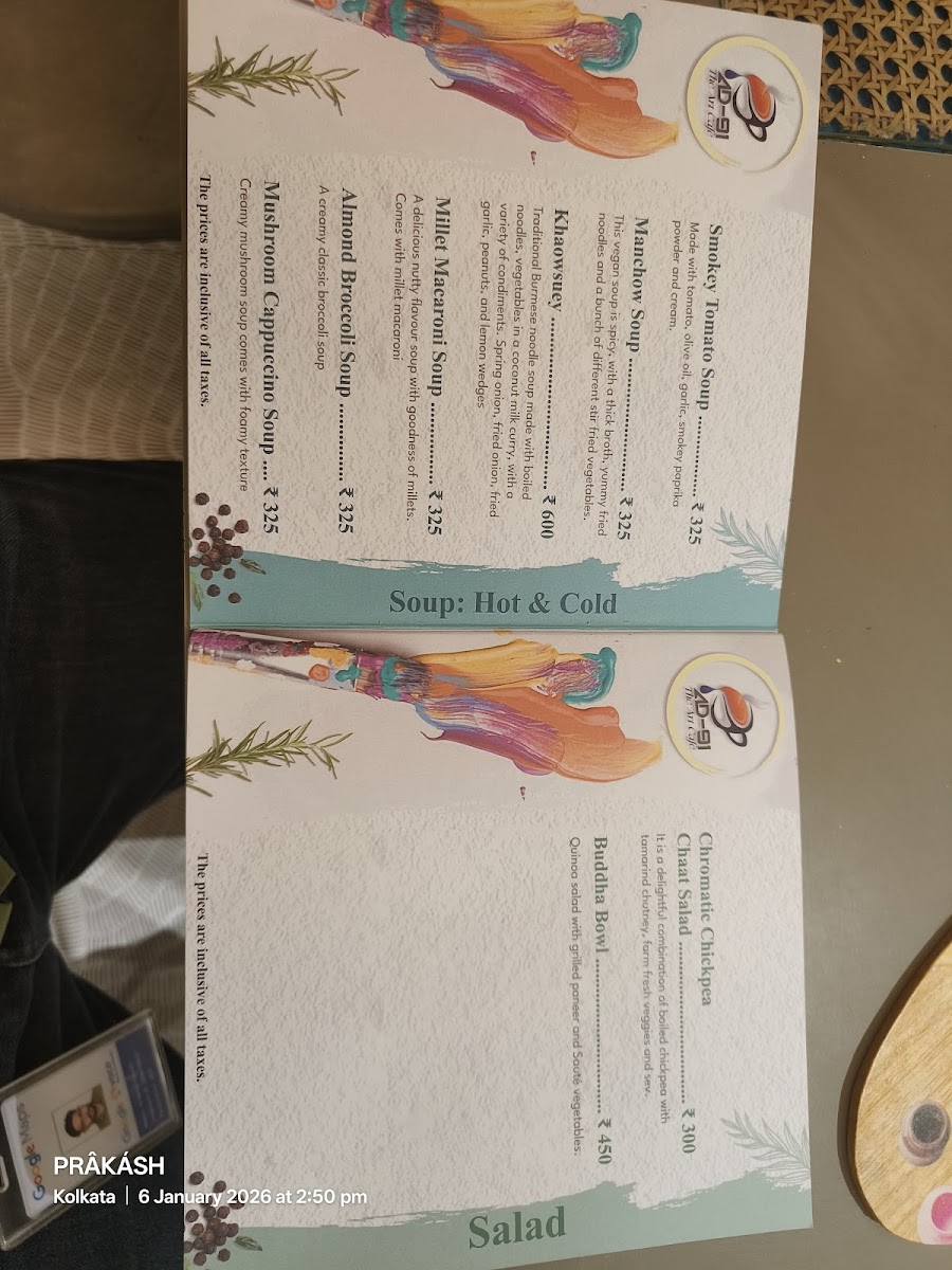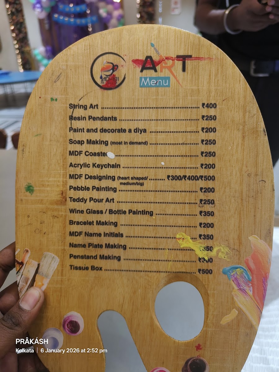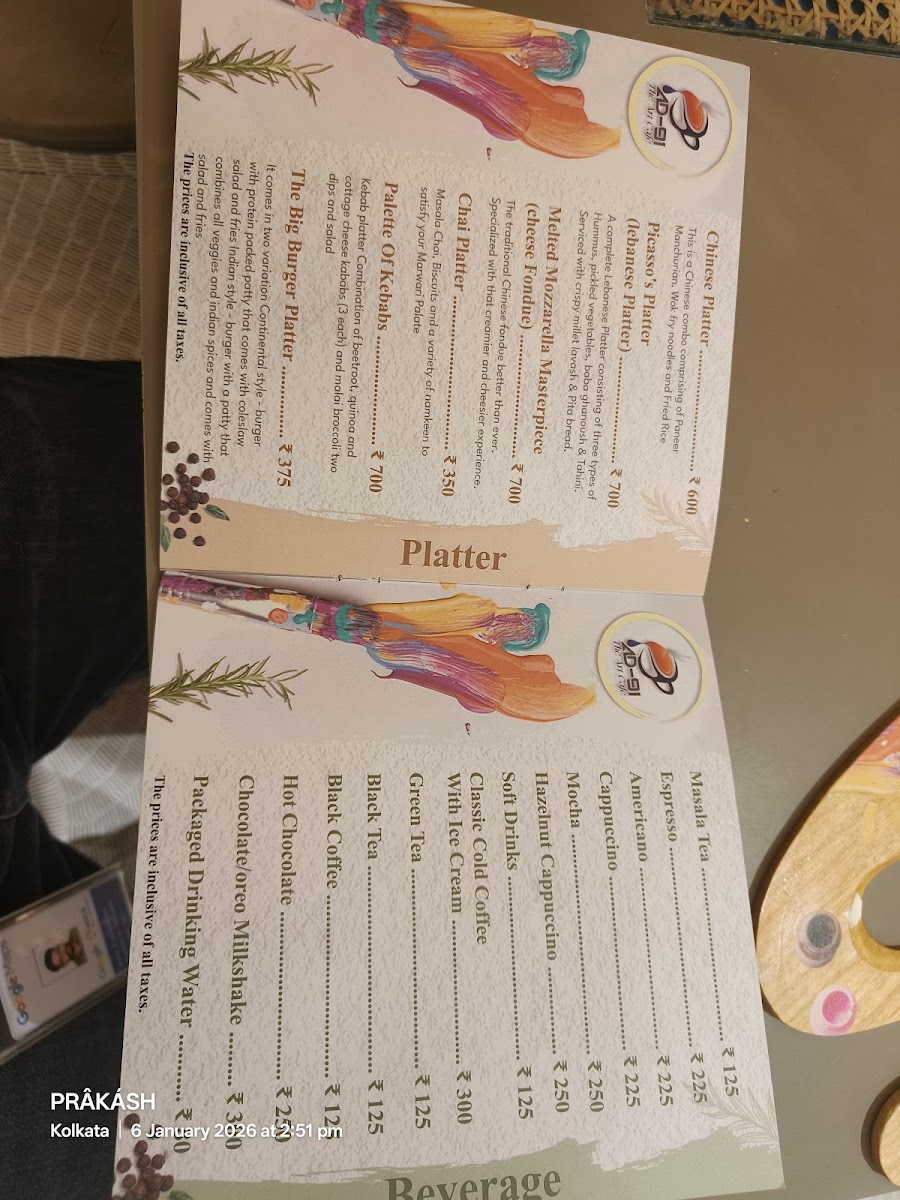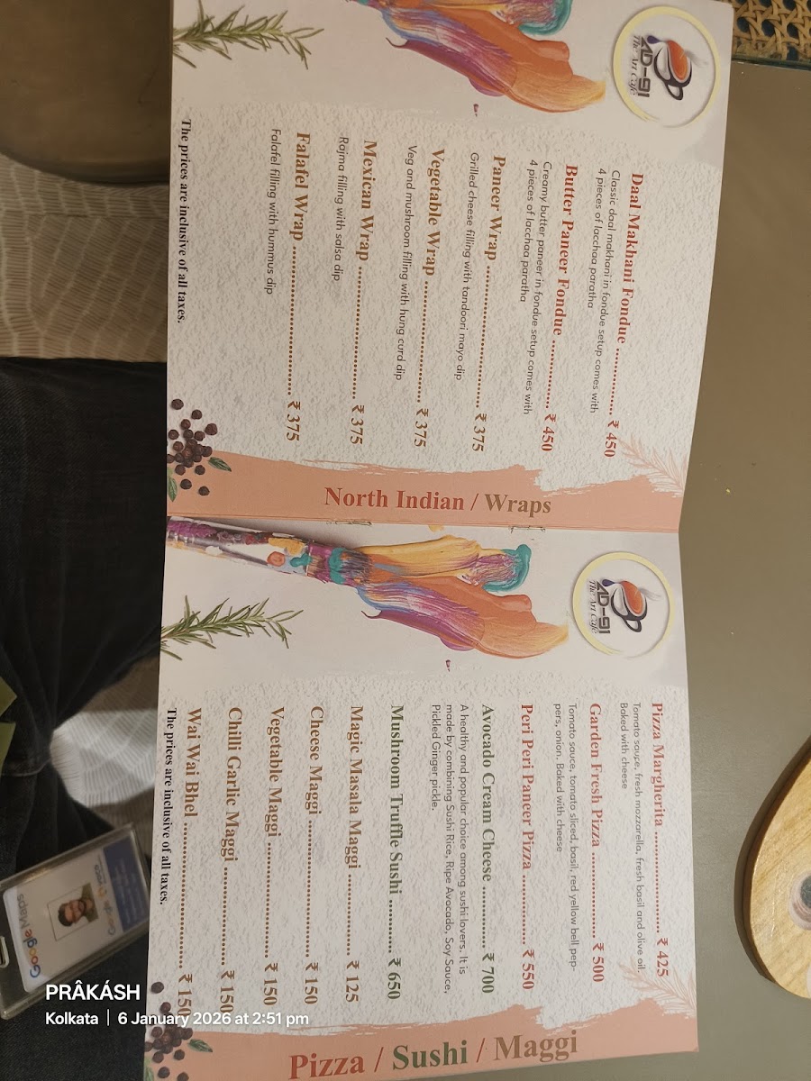 The menu structure is designed to complement the creative and relaxed setting, making it suitable for coffee breaks, casual meetups, and light meals throughout the day. Food items typically include vegetarian dishes with simple preparations, and drinks are offered to accompany the art activities or social gatherings.